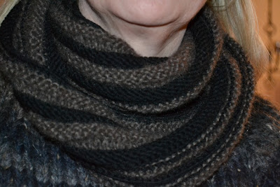 Die Drehung kommt auch bei der Länge und beim doppelten Um-den-Hals-legen zur Geltung. Der lange Möbius wirkt nicht wie ein Rollkragen oder ein um den Hals gelegter Schlauch.