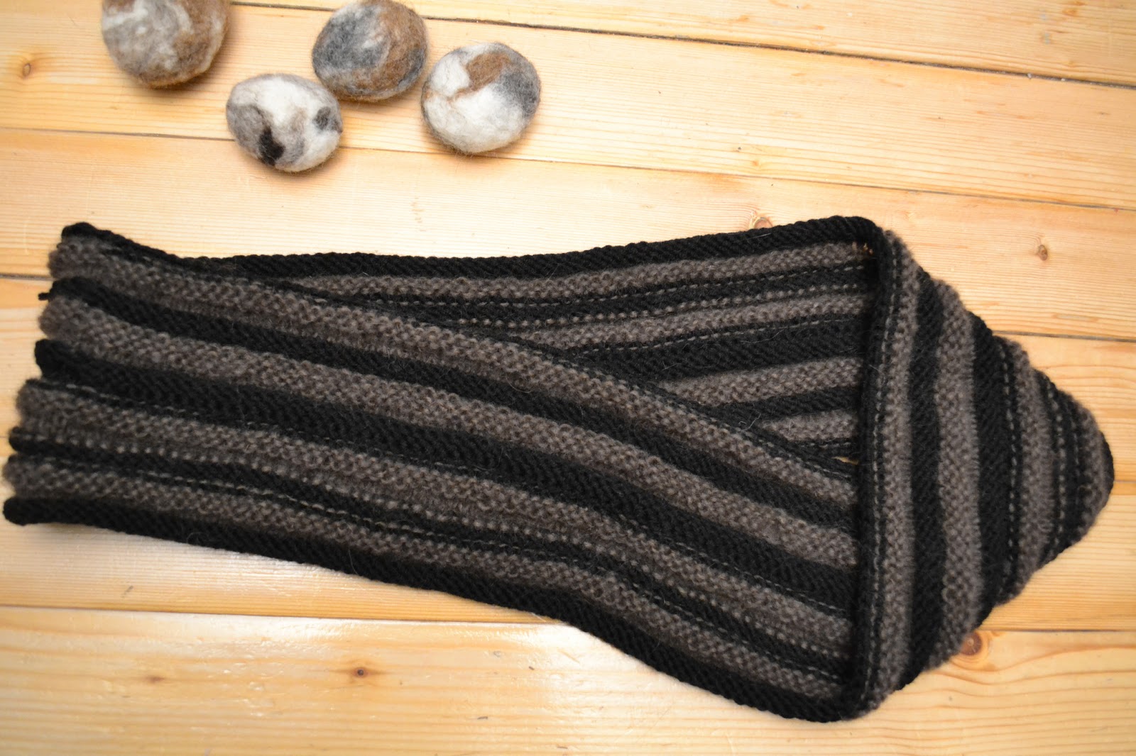 Für den zweiten Versuch schlug ich 180 Maschen an und verwendete zu dem schwarzen Schurwollgarn noch einen Knäuel braunes Mohair. Für den Rippencharakter strickte ich jeweils drei Reihen rechts und drei Reihen links in schwarz, drei Reihen rechts und drei Reihen links in braun, usw. Zwischenzeitlich dachte ich, dass es eigentlich Quatsch ist bei einem langen Schal eine Drehung einzuarbeiten und ob ich es mir nicht leichter gemacht hätte einfach einen Schlauch in die Höhe zu stricken. Doch es macht meines Erachtens auch bei einem langen Schal Sinn.