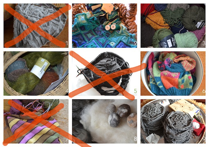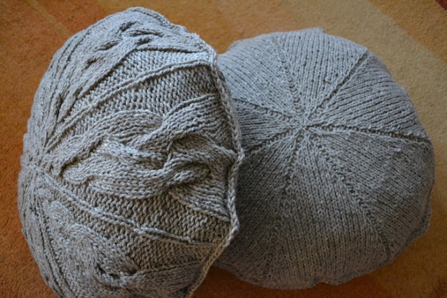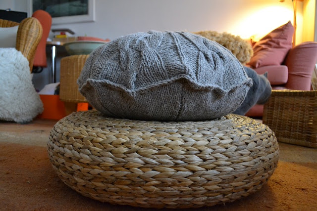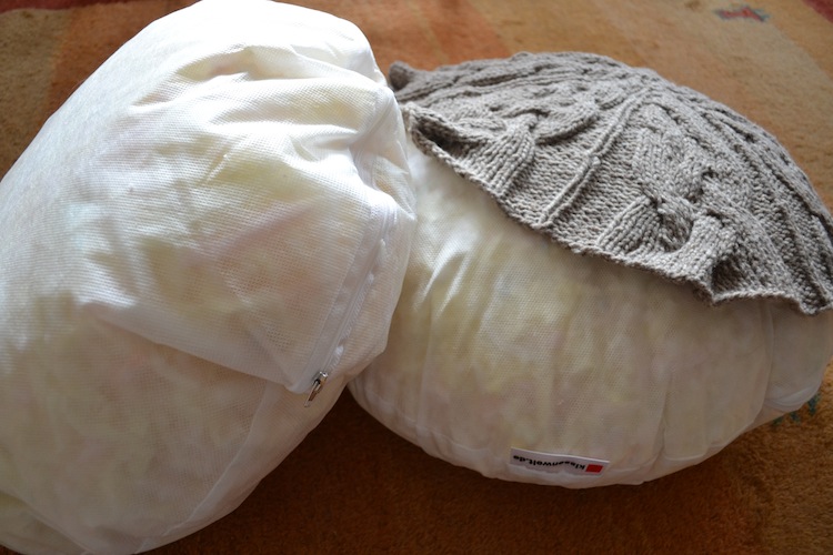 Letztes Jahr fiel mir das Material beim Aufräumen wieder in die Hände und mir war jetzt schnell klar was daraus werden wird – daraus stricke ich noch ein paar Bodenkissen, wie schon diese hier. Allerdings wusch ich etwas des Wollfetts vor dem Stricken heraus.
