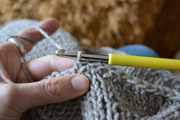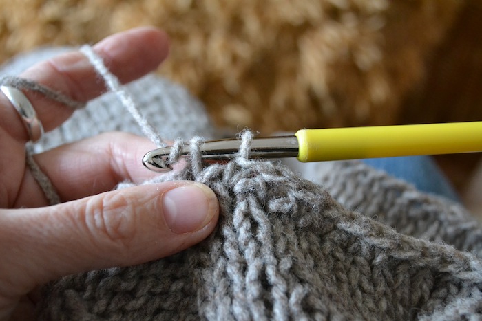 Durch die letzte Schlaufe wird der abgeschnittene Wollfaden zum Sichern gezogen. Der Anfangsfaden und der Endfaden werden mit einer dicken Sticknadel vernäht.