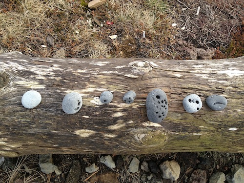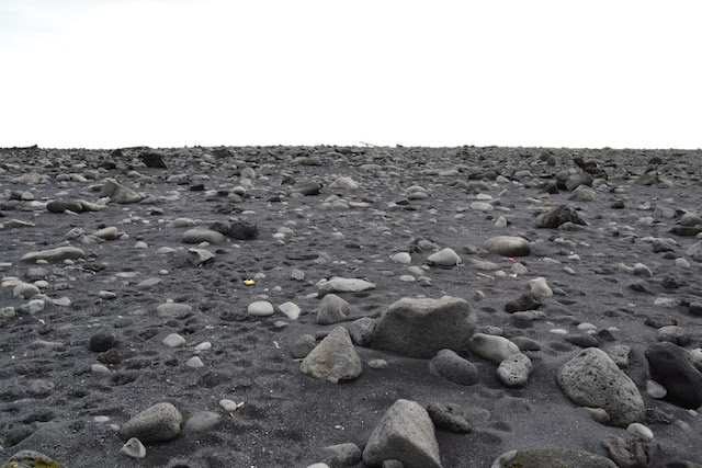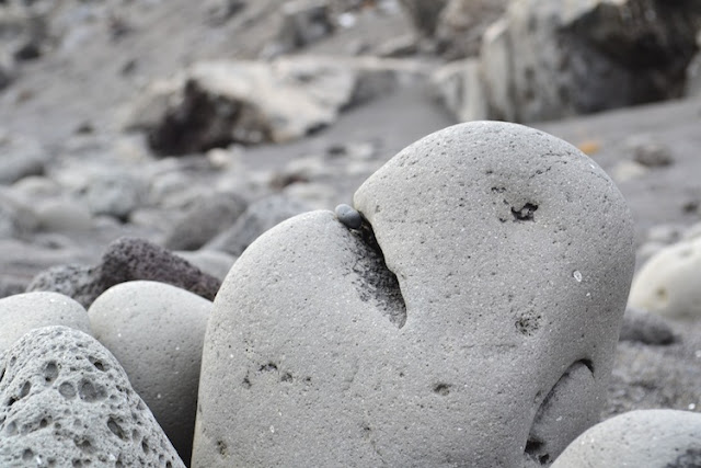 Doch bis zu den Ruinen des Dorfes kamen wir nach dem Abstellen des Autos gar nicht. Das was Natur und Landschaft an dieser Stelle boten war so faszinierend. Schwarze Felsen, schwarzer Sand, Treibholz, Brandung vom Feinsten und Steine ohne Ende. Steine mit Löchern. Ein Traum für mich Lochstein-Sammlerin!!!