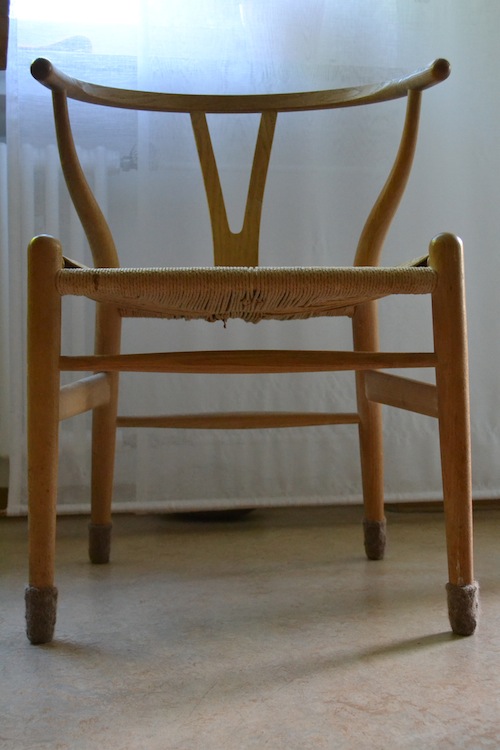 Sofort nach dem Waschen müssen die noch feuchten Stuhlstiefelchen von der Folie befreit, mit Schmackes auseinandergezupft und am besten direkt über dem Stuhlbein in Form gezogen werden.