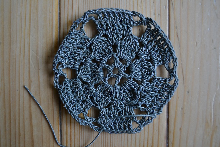 Nach einem einfachem Baumwollgarn – es war zu dick, verwendete ich ein veredeltes – war zu störrisch. Zuletzt häkelte ich mit einem Mischgarn aus Baumwolle (55 %), Polyamid (25 %) und Seide (20 %) von Lana Grossa.