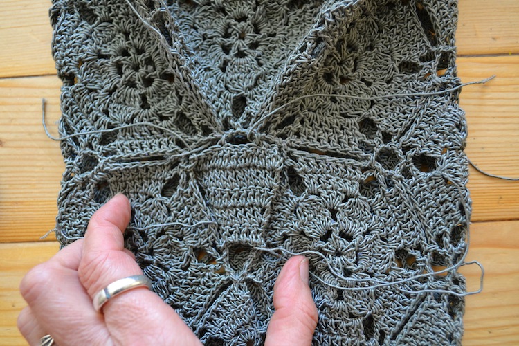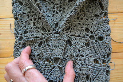 Die Häkelanleitungen sind problemlos nachzuarbeiten, aber beim Zusammennähen wird man ziemlich alleine gelassen. Ich berichtete über mein Problem, die zwei geforderten Dreiecke eingepasst zu bekommen, im letzten Post. Nach dem Aufwand 135 Rosetten zu häkeln (ich rechne mal die paar anderen Teile nicht dazu), zusammenzunähen und zu vernähen, möchte man doch endlich zum Ende und einem Ergebnis kommen! Oder?