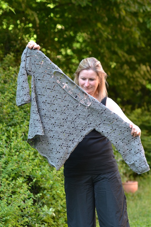 Ich stehe eigentlich überhaupt nicht auf gehäkelte Kleidungsstücke, aber ich lasse mich immer wieder von ausgefallenen Mustern und Materialien verführen. Unvergessen ist mir ein Seidenpullover in tunesischer Häkelei, der bei der Fertigstellung auch ein echtes Schwergewicht war und trotzdem ein Lieblingspullover wurde.
