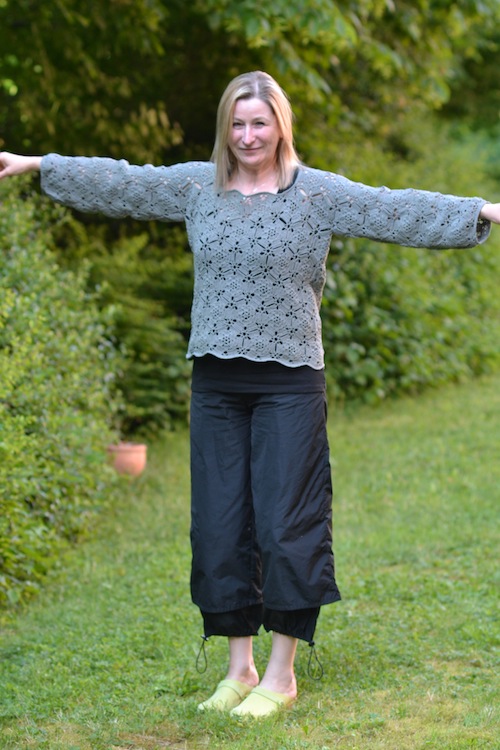 Ich stehe eigentlich überhaupt nicht auf gehäkelte Kleidungsstücke, aber ich lasse mich immer wieder von ausgefallenen Mustern und Materialien verführen. Unvergessen ist mir ein Seidenpullover in tunesischer Häkelei, der bei der Fertigstellung auch ein echtes Schwergewicht war und trotzdem ein Lieblingspullover wurde.