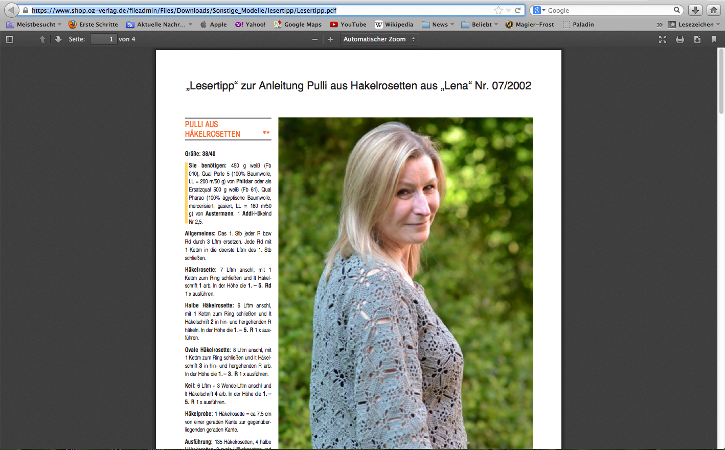 Es ging um die Realisierung eines Pullovers aus einem Handarbeitsheft (Lena vom Juli 2002) und ich berichtete von den Anfängen, den Höhen und Tiefen, den Problemen und dem Glücksgefühl: Der Pullover ist fertig und passt!