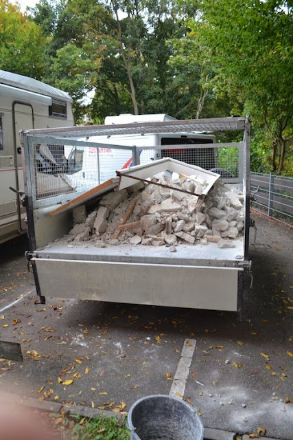 Der Schuttberg, der heute durch den Abbruch der Wände entstanden ist war deutlich größer, als der von gestern. Ohne die Türen, Stahlzargen und der Badewanne wog der Schutt gestern auf der Abnahmestelle ca. 800 kg. Heute werden es deutlich mehr sein!