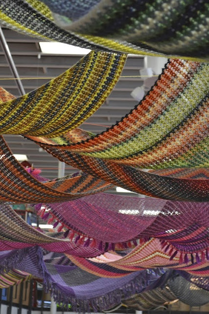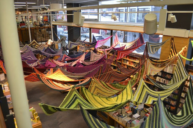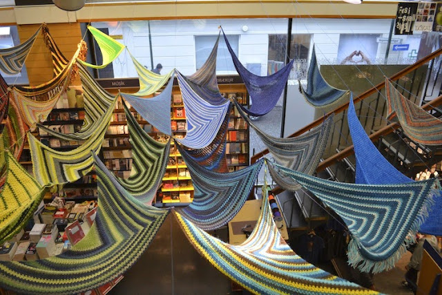 Von der Decke hingen Mengen an farbigen Dreieckstüchern. Von den Angestellten erfuhr ich, dass diese Dekoration anlässlich einer Buchherausgabe entstanden ist, einem Häkelbuch, übersetzt „Maria’s Häkelbuch“. So erkannte ich beim näheren Hinschauen, die Tücher sind tatsächlich alle gehäkelt und nicht gestrickt, wie Tabatas. Ob gehäkelt oder gestrickt, ich fand diese Anordnung sehr dekorativ und ansprechend.