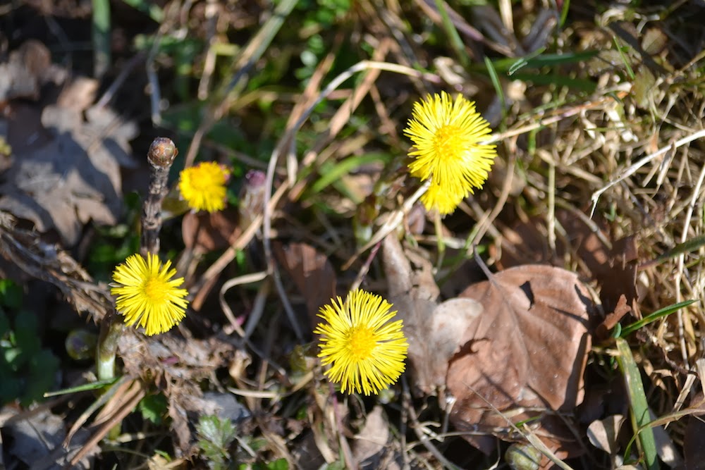 Doch nicht nur an geschützten Stellen zeigt sich der Frühling. Wer die Augen eher zum Boden richtet sieht im Wald den Huflattich blühen.