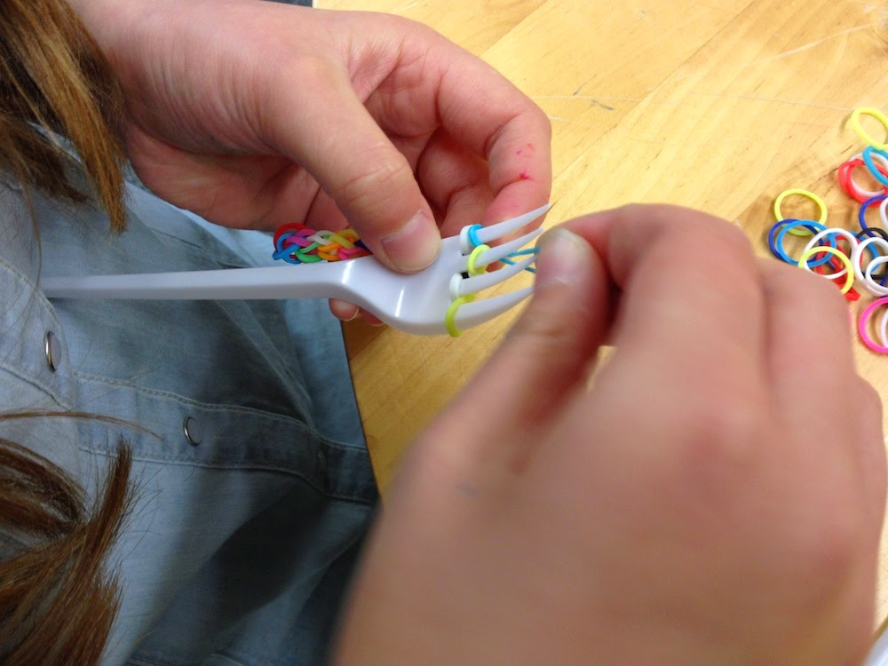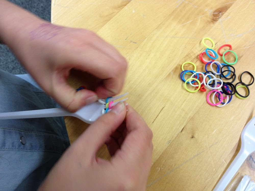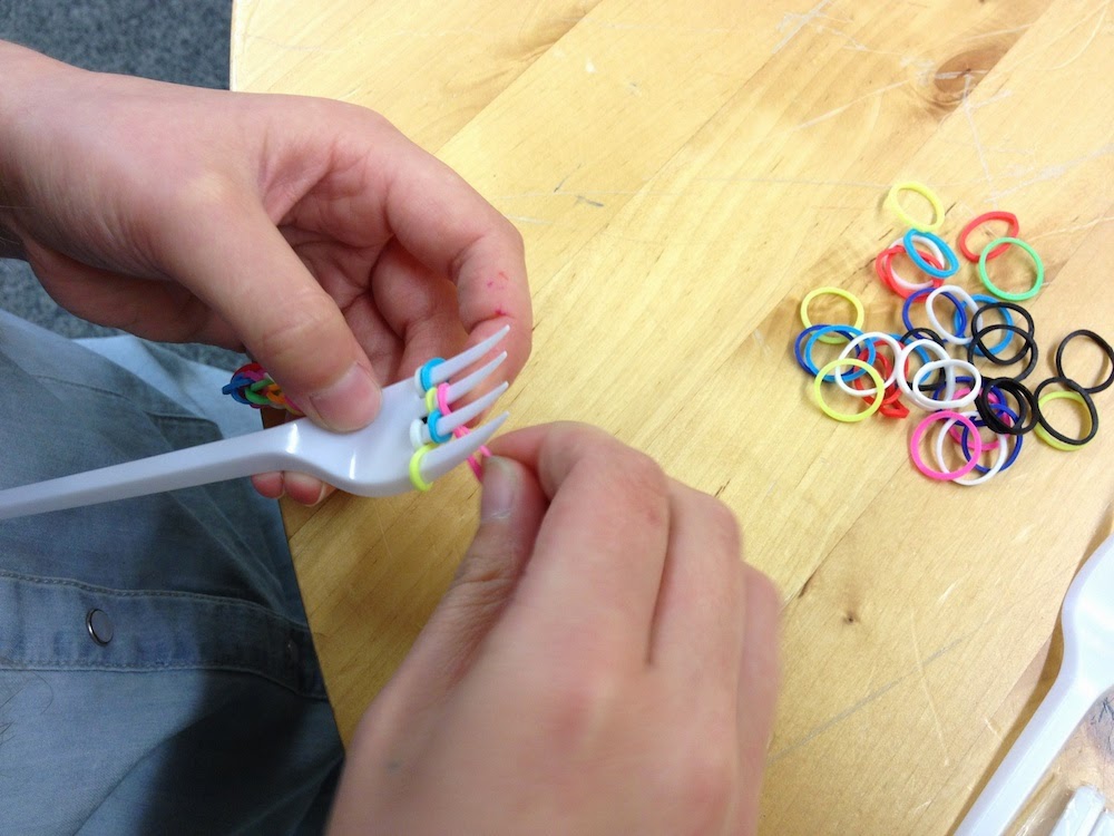 Das Prinzip ist ein regelmäßiges Legen und Verdrehen und Übereinanderheben von den Gummiringen über Gabelzinken, wie es zum Beispiel in diesem Video auf Youtube zu sehen ist – die Technik, die ich heute mit meinen Schülern verwendet hatte.