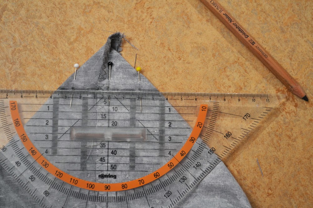 Dazu lege ich an den Ecken die Nähte aufeinander, stecke sie fest und messe/zeichne mithilfe des Geodreiecks die nötige Naht.