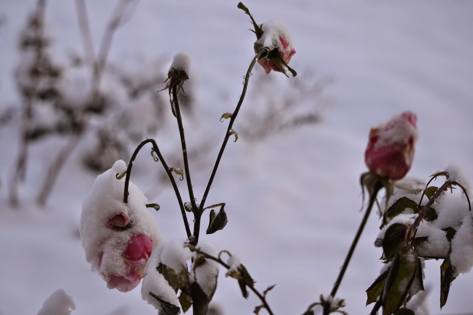 Oh meine Rosen, die noch vor Tagen so herrlich blühten! Jetzt sind sie mit Schnee bedeckt!