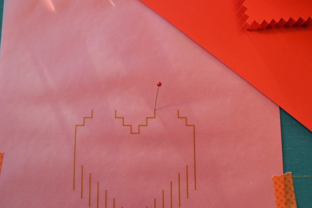 Die Eckpunkte der Linien werden nun mit einer Stecknadel, oder einem anderen spitzen Gegenstand, durch das Transparentpapier in das später zu schneidende Papier durchgedrückt.