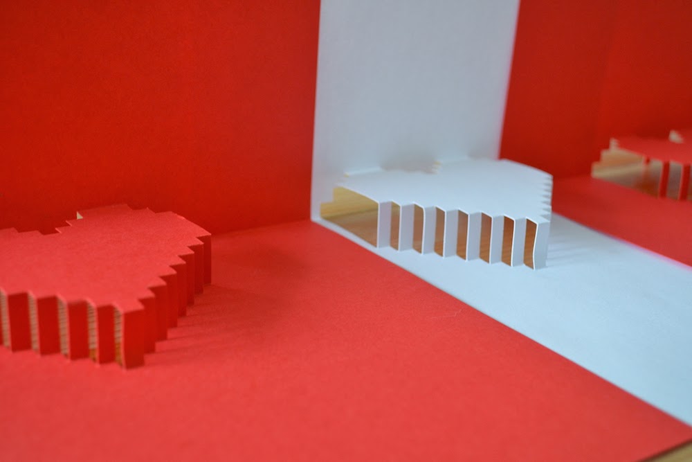 Ich beginne mit dem Kartenfalz, rechts und links vom Herz. Danach falte ich die zwei oberen Herzbögen um dann langsam die Karte zusammenzufalten. Mithilfe einer Stricknadel (die lag dort gerade herum) oder einem Stift können die schmalen Streifen in die richtige Richtung dirigiert werden. Zum Schluss liegt meine Karte dann so platt da.
