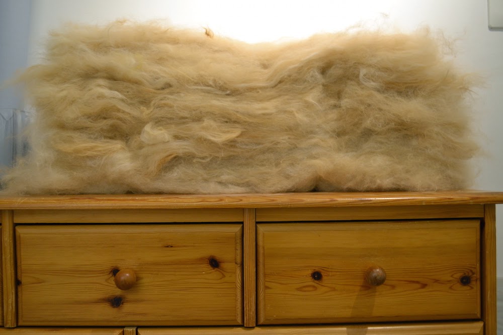 Den Haufen von Hand aufzuarbeiten gab ich bald auf. Um den Nadelbelag meiner Handkarden stand es nicht zum besten und es dauerte ewig bis ein Haarbällchen entknubbelt war. Die Anschaffung einer Trommelkardiermaschine reizte mich, aber diese Geräte sind nicht unbedingt billig zu nennen. Außerdem fürchtete ich, der Kardiermaschine wird es genauso gehen, wie meiner neuen Nähmaschine. Diese wartet seit dem Kauf immer noch auf ihren ersten Einsatz.