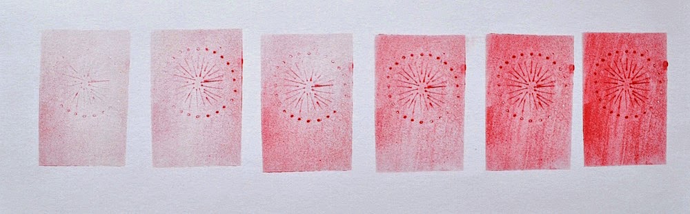 Bei den ersten Versuchen wurde der Moosgummi mit Nadeln und Teppichmessern geritzt, Kerben geschnitten, Vertiefungen mit Kugelschreibern gedrückt und mit Holzbohrern gebohrt.