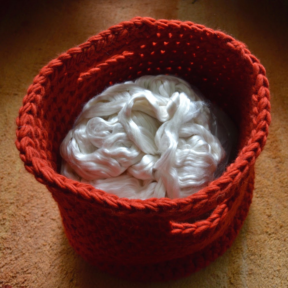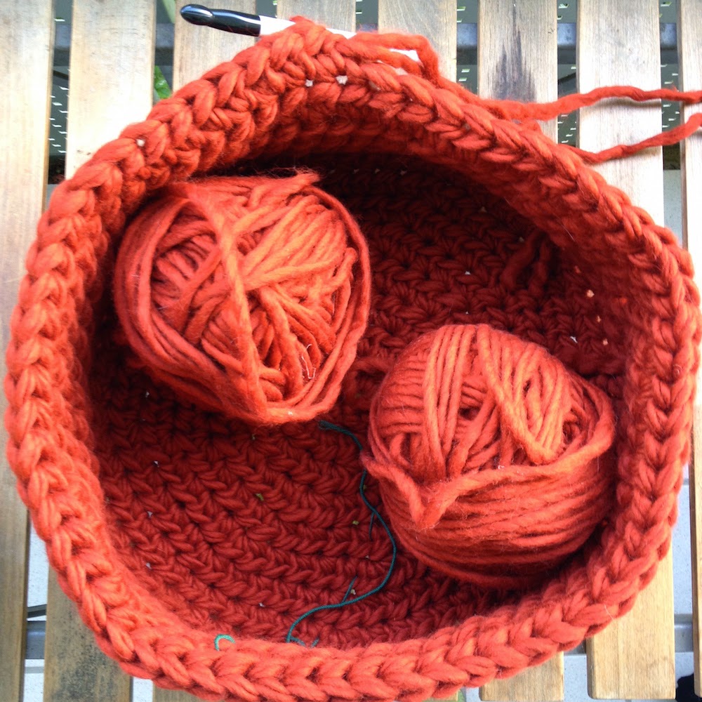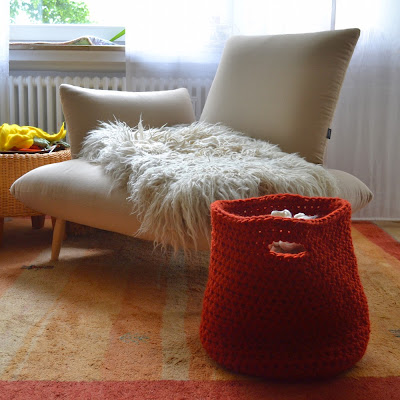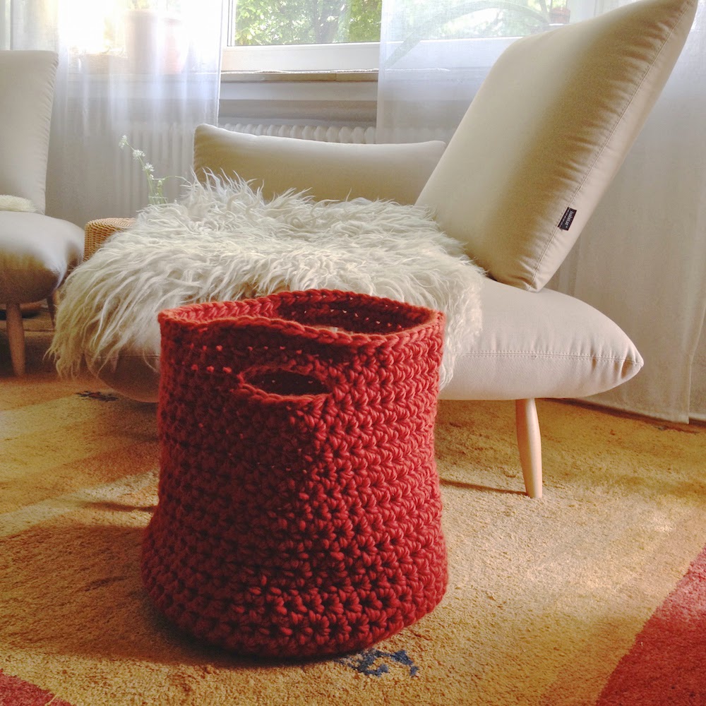 Da steht er endlich, der Häkelkorb als erstes Häkelwerk des Jahres 2015. Es ist ein Schwergewicht, denn es stecken sechs Stränge Dochtwolle à 200 g drin!