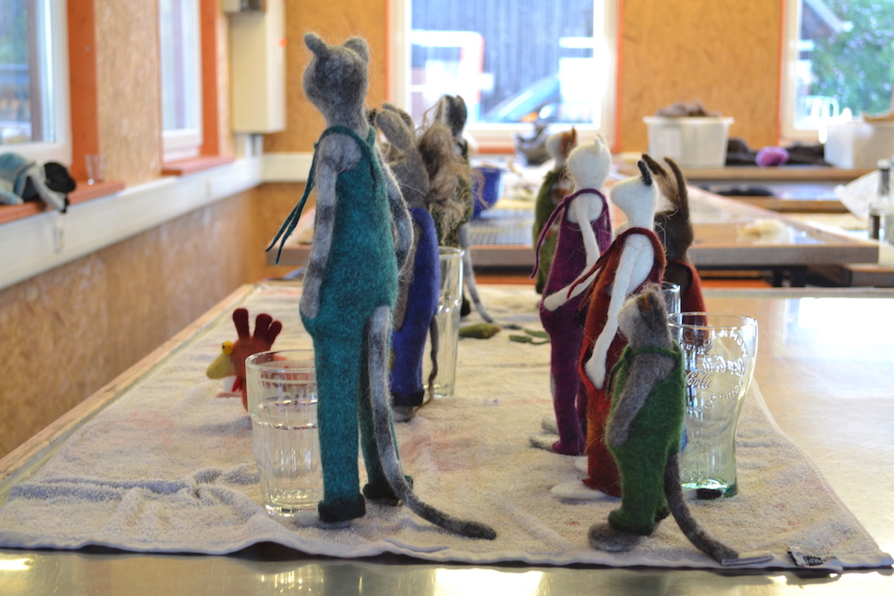 Da stehen sie, die ersten „Viecher“ aus der Tiermenagerie, die von uns zwölf Teilnehmerinnen in einem dreitägigen Filzkurs in Oberrot entstanden sind.
