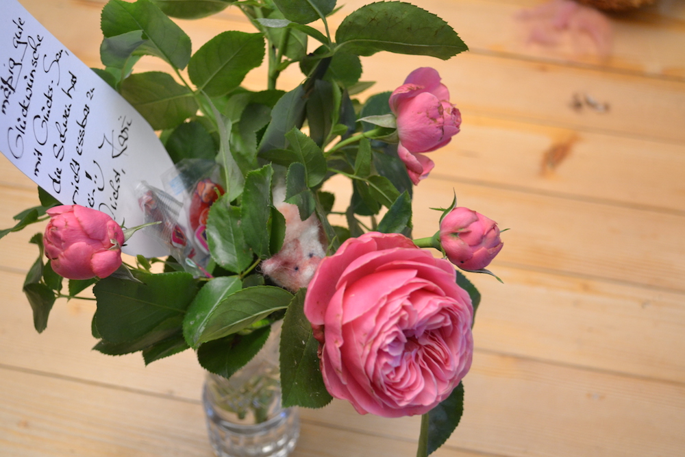 Dazu musste allerdings noch einmal Blut fließen, beim Schneiden der Rosen in meinem Mini-vor-dem-Balkon-Garten, denn solch ein Schwein in Papier zu verpacken geht gar nicht! Solch ein Schwein passt am besten in einen rosa Rosenstrauß hinein!