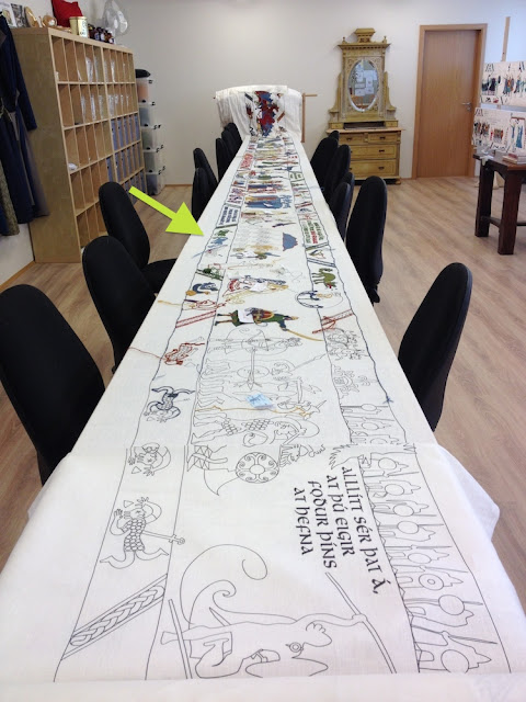 Das alles sehe ich jedoch erst am späten Nachmittag, nachdem ich mich für drei Stunden, aus dem Regen, dem Wind und der Nässe kommend, im Saga-Museum zu den Stickerinnen und Stickern gesetzt hatte. Dort wird seit zwei Jahren die Geschichte der Njals-Saga gestickt, ein Werk, das zum Schluss ca. 90m lang sein wird.