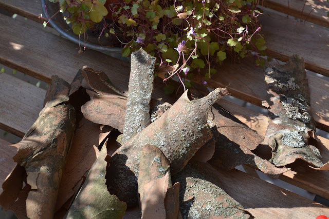 Zweiter Ausgang sind Rindenstücke! Ich sammelte meine nach einem Sturm im Juli, als die Platanen alle auf einmal ihre Rinde abwarfen. Kurz vor Schuljahresende hatte ich zwar keinen Kopf und keine Idee was ich damit anfangen könnte, doch ich sammelte einen ganzen Schwung davon ein.