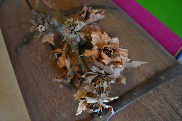 Ausgang für dieses Gesteck sind Rosen aus Herbstlaub, wie ich sie letztes Jahr hergestellt hatte. Es sieht kompliziert aus, aber meine 12- bis 14jährigen Schüler/innen haben es spätestens beim zweiten Versuch auch hinbekommen.
