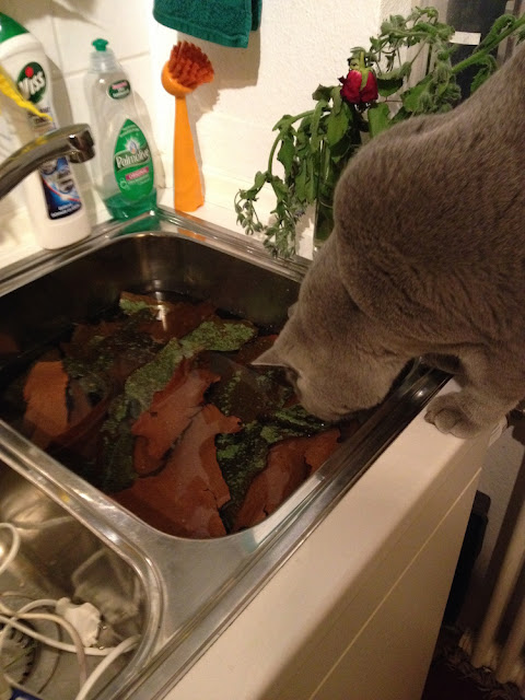 Zuhause krumpelten sich die Teile in der Sommerhitze so schnell zusammen, dass ich alle Borkenstücke einweichte (zu Chewbaccas Freude). Wieder weich geworden wickelte ich die Borkenstücke zum Trocknen um Flaschen, fixierte die Gebinde mit Gummibändern und Schnüren und vergaß alles auf dem Balkon.