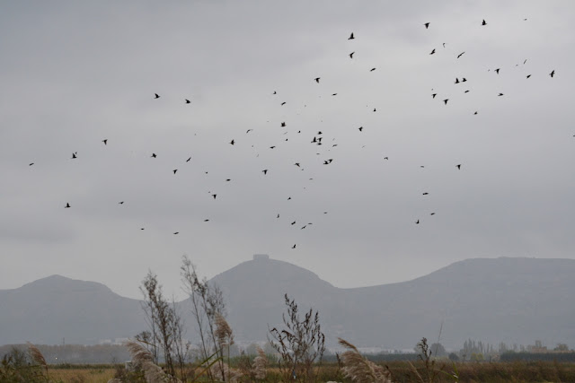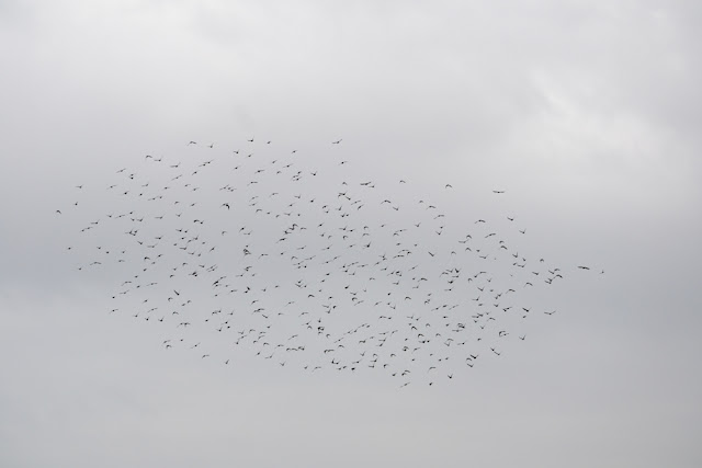 Seit Jahren hatte ich keine Störche mehr gesehen und schon gar nicht in dieser Anzahl. Doch bevor ich mich auf Fotografierweite herangepirscht hatte flogen alte Bekannte vor mir auf – Stare, viele Stare, die sich vom grauen Himmel und Regen nicht verscheuchen ließen.