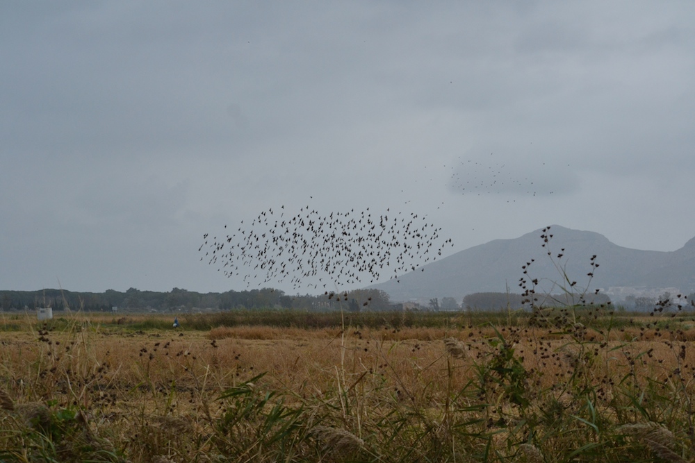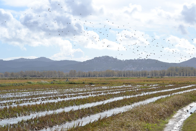 Es wird Reis in Spanien angebaut! Kaum zu glauben, aber, klar, das Nationalgericht im Osten Spaniens ist Paella. Keine Paella ohne Reis und der wird in Katalonien angebaut, hauptsächlich in der Gegend rund um Valencia. Aber auch in der Gegend rund um Pals, am Fuß des grauen Berges, dem Montgri, finden sich weite Flächen, auf denen Reis steht. Jetzt im Herbst wird er geerntet und auf den freien Flächen tummeln sich Vögel in Mengen!