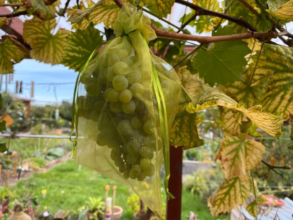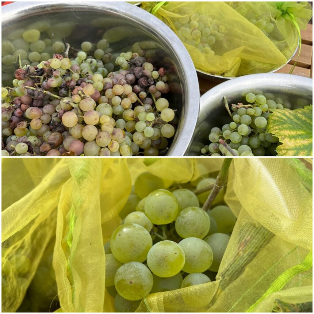 Die Trauben dort hatte ich vor der Reife in Fruchtschutzbeutel gepackt. Ich bezweifle, ob ich das noch einmal machen werde. Es kommen dadurch zwar keine Wespen und Hornissen an die Weinbeeren, aber Minifliegen, Ameisen, Pilzsporen und noch vieles anderes. Sie alle finden ihren Weg durch die feinsten Gewebe.