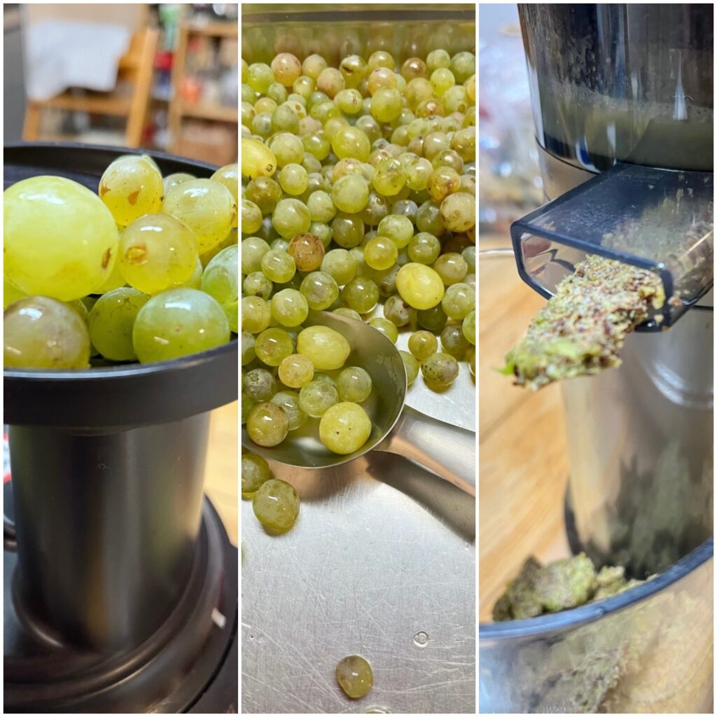 Erst die hellen Trauben, dann liefen die dunklen durch den Entsafter. Die rosafarbenen wurden alle lieber gegessen.