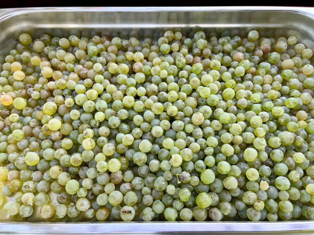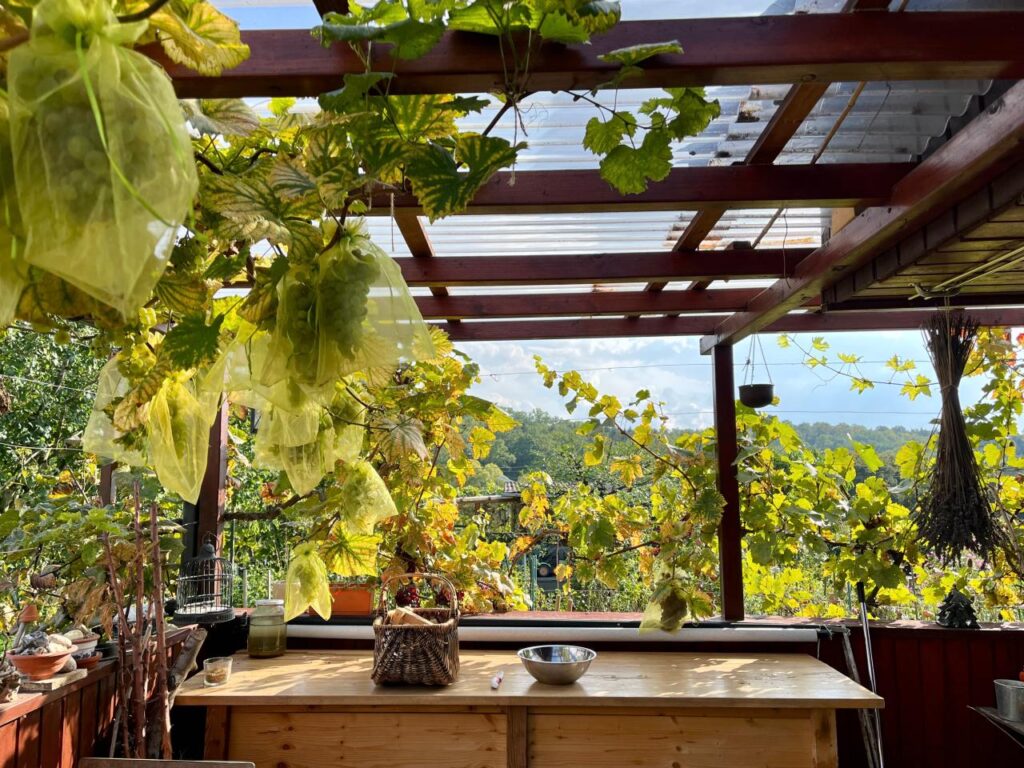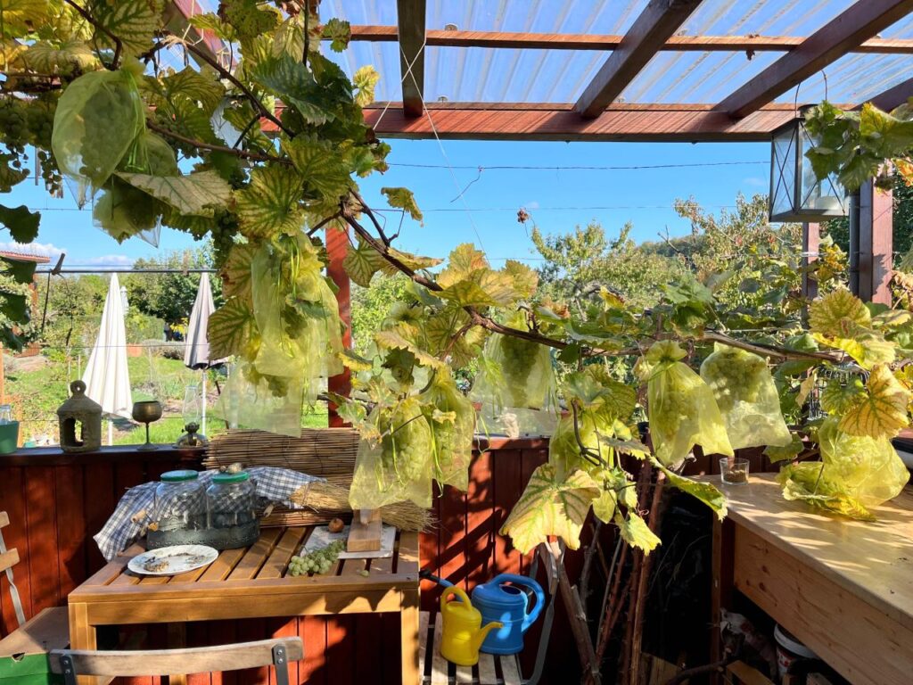 Ich hatte meine Reben im Verlauf des vergangenen Winters von zwölf auf neun reduziert, im Frühjahr und Frühsommer nach Qualität und nicht nach Quantität geschnitten, da ich vergangenes Jahr schon eine reichliche Ernte hatte. Das Ergebnis fiel erfreulich lecker aus, doch trotz großzügigem Rückschnitt in der Wachstumsphase entwickelten sich Trauben über Trauben. Solch üppiges Wachstum hätte ich mir für die Tomaten gewünscht. Nun denn, dann eben Trauben, weiße, rosa und dunkle Trauben. Mengen verschenkte ich und Mengen standen auf meinem Speiseplan, bis ich keine mehr sehen mochte.