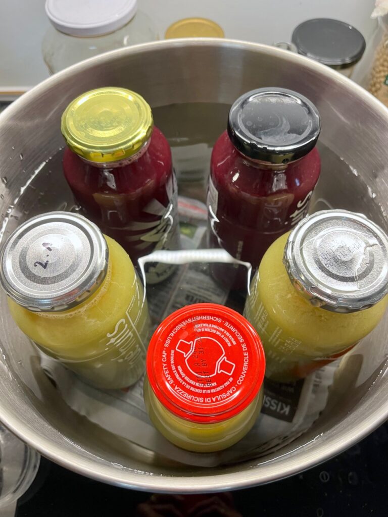 Zum Entsaften verwendete ich einen Slow-Juicer von Panasonic, der vor allem für Gemüsesäfte geeignet ist. Für Obst habe ich das Gerät bisher nur für Schwarze Johannisbeeren eingesetzt. Da floss statt Saft eine Art Gelee ab. Das Saftergebnis bei den Trauben fiel auch recht trüb aus, was beim Sterilisieren durch das Absetzen der Schwebstoffe noch deutlicher wurde. Geschmacklich gut, optisch naja.