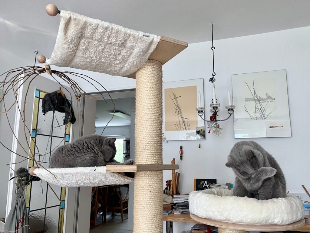 - der Katzenkratzbaum war eigentlich ein klarer Fall von weg-damit, denn die beiden Pelze hatten ihn seit Monaten nicht genutzt. Mühsam hatte ich das Teil aus meinem ehemaligen Schlafzimmer ins Wohnzimmer gewuchtet, um ihn dort bis zum Demontieren/Abgeben/Entsorgen zu parken.