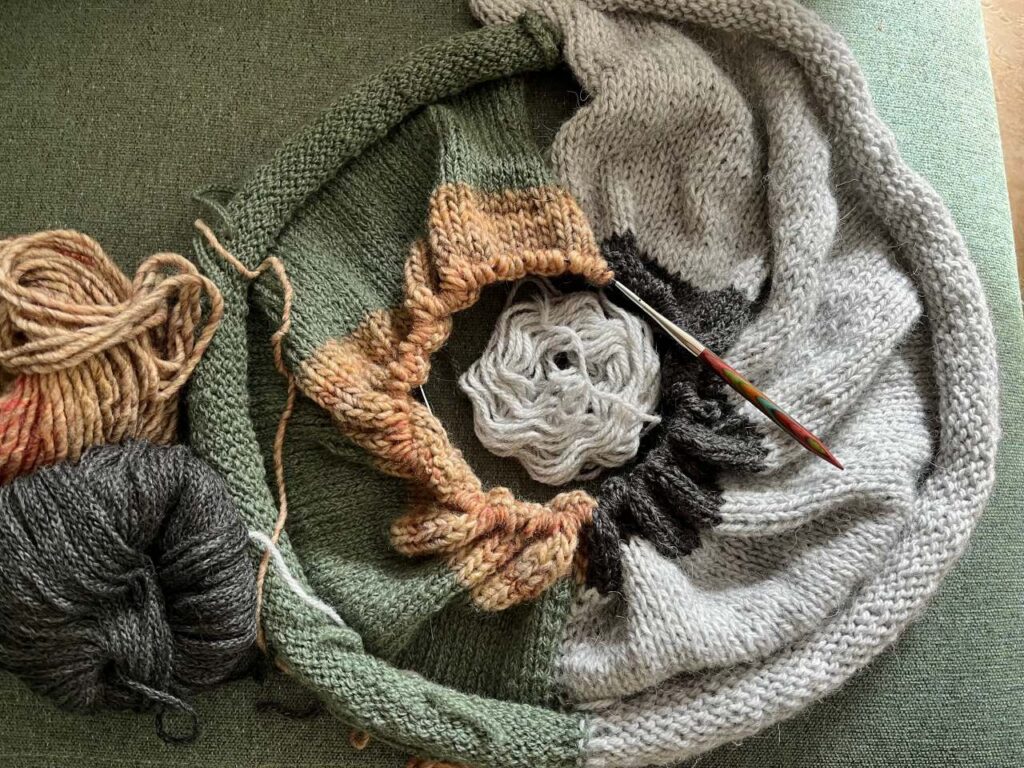 - das Pulloverstrickwerk stagniert. Zumindest ist die Schulterpartie fertig