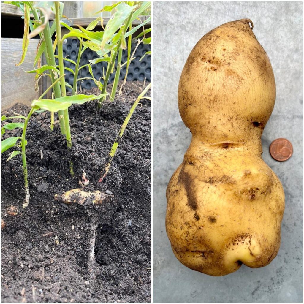 Zuerst einmal grub ich vorsichtig um das Ingwergrün herum und entdeckte nebenbei eine übersehene Knolle aus der Kartoffelernte.