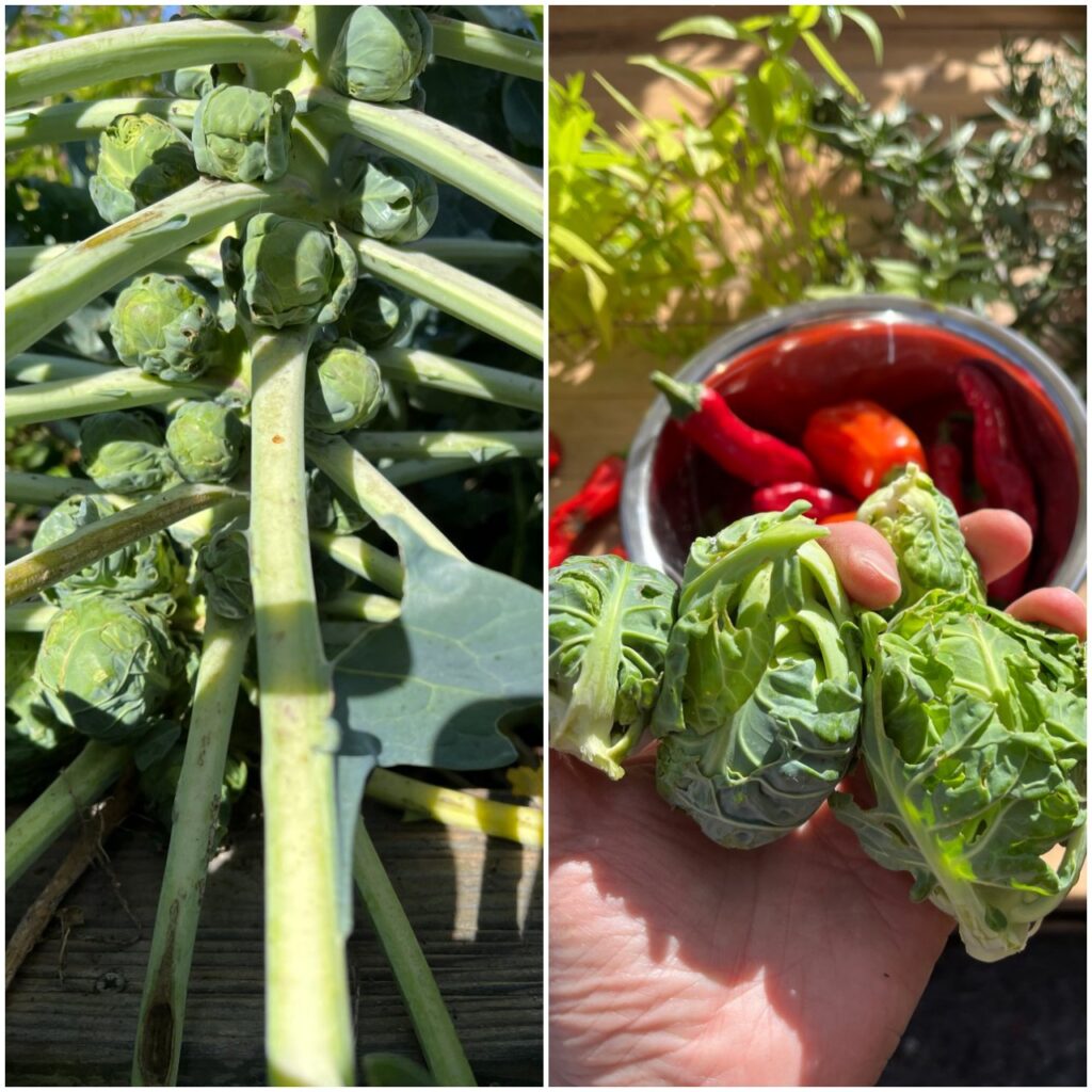 Überraschung an anderer Stelle vom Hochbeet, als ich Chilifrüchte erntete. An der Rosenkohlstaude hatten sich erste Röschen gebildet, die nach Ernte riefen. Mit der Kartoffel zusammen waren die Hauptzutaten für das Abendessen zusammen.