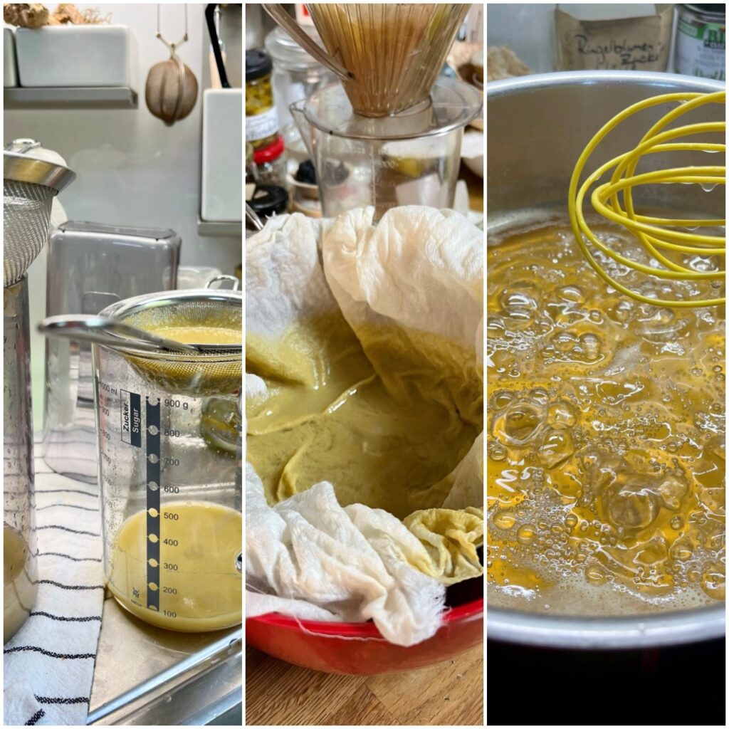 Spontan öffnete ich die ersten Flaschen, schöpfte die oberen Ablagerungen mit dem Löffel heraus, bevor ich den Flascheninhalt in ein erstes Sieb schüttete. Dann noch einmal durch ein feineres Sieb und durch ein feuchtes Baumwolltuch, bevor im Topf ein wunderbar klares Traubengelee köchelte. Ein Aufwand, der Zeit benötigte und Platz, den ich erst einmal frei arbeiten musste. Das Ergebnis war es wert!