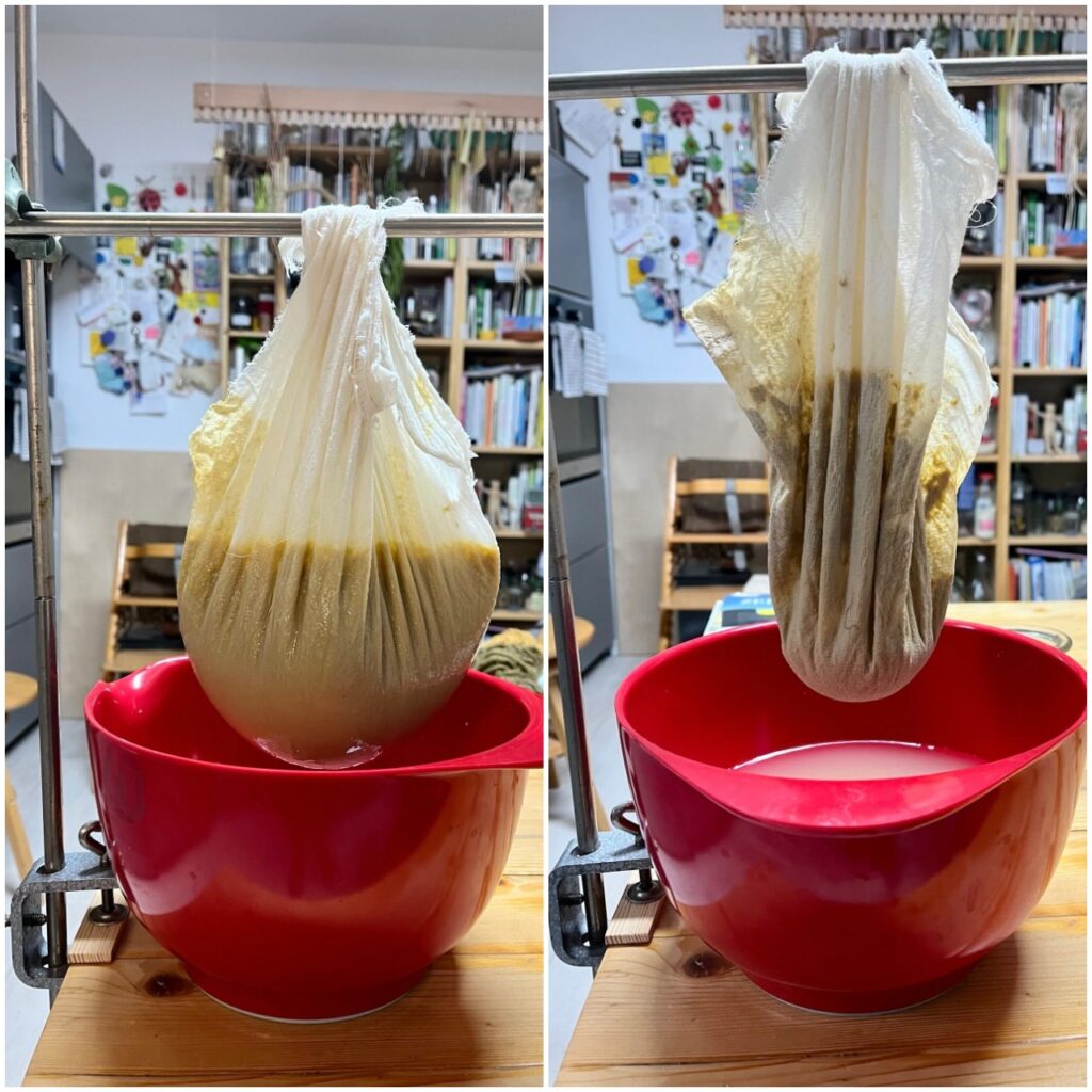 Stativ-Gestänge aufgebaut, ein Baumwolltuch angefeuchtet und zum Beutel geknotet, eine Schüssel darunter und das trübe Traubensaftgemenge hineingeschüttet. Der Rest war einfach Abwarten.