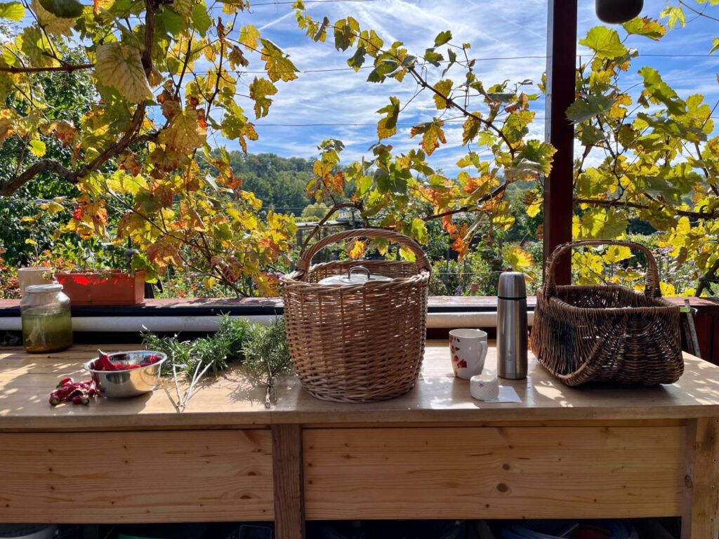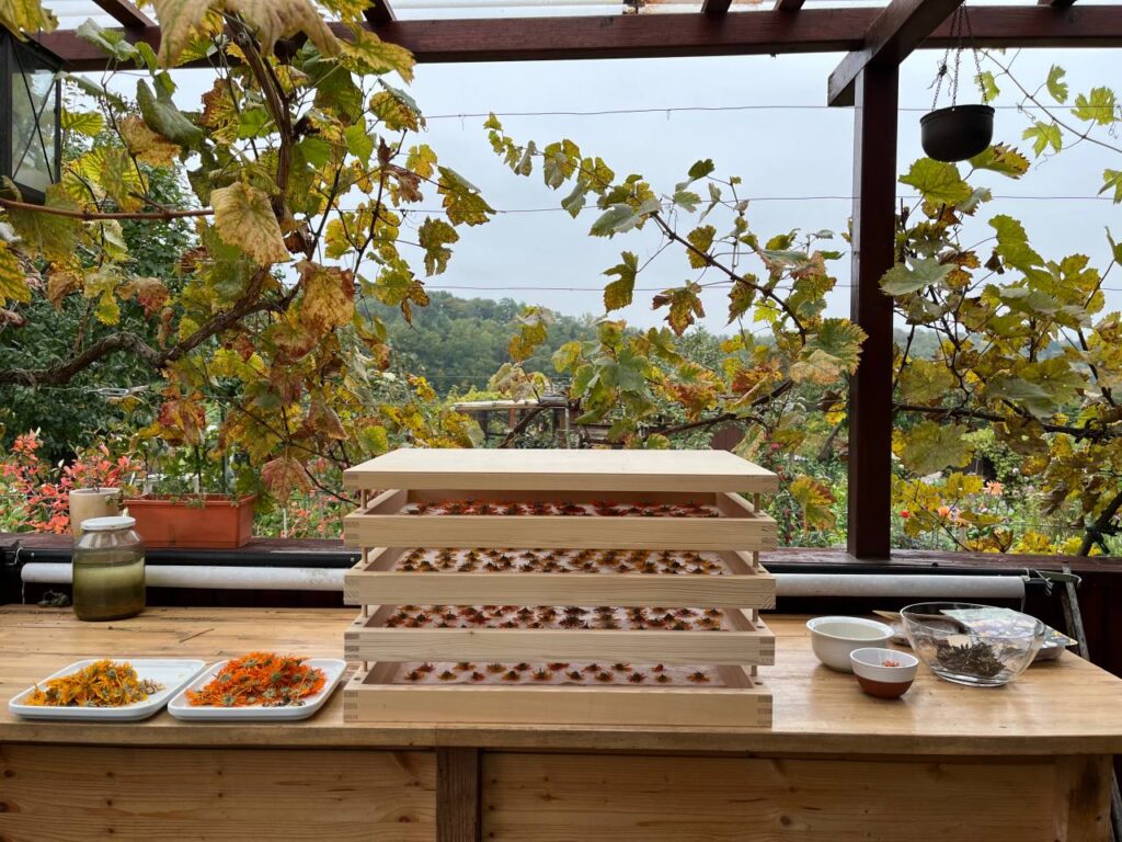 Es wird Zeit die Gartenhütte für die Pflanzen, die Winterschutz benötigen, vorzubereiten. Dazu musste zuerst das Trockengestell mit den Ringelblumen und einer Handvoll anderer Färberpflanzen geleert und weggeräumt werden.