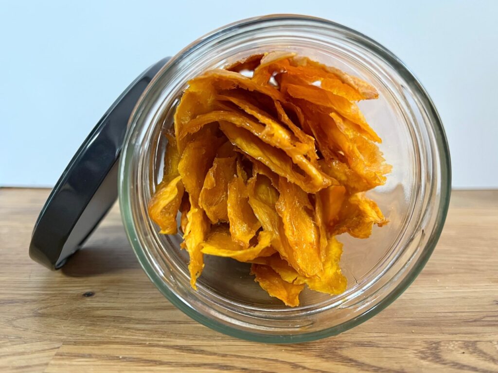 Mitten in das Geschehen traf das Crowdfarming-Paket ein, mit superreif duftenden Mangos. Mir war nicht nach Mango-Chutney, nach essen zu diesem Zeitpunkt auch nicht, also kamen sie in den Dörrautomaten. Das Ergebnis ist sehr lecker!