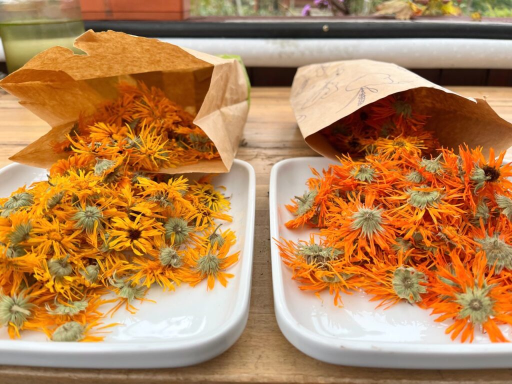 Einige Blütenköpfe kamen zusammen, von denen ich in den nächsten Tage fleißig die Körbchen wegzupfen werde. Ringelblumen sind Korbblütler. Jedes „Blütenblatt“ ist eigentlich eine Blüte, die zusammen mit anderen an einem Körbchen sitzt. Ich hoffe meine Ernte 2025 reicht für die geplanten Vorhaben.