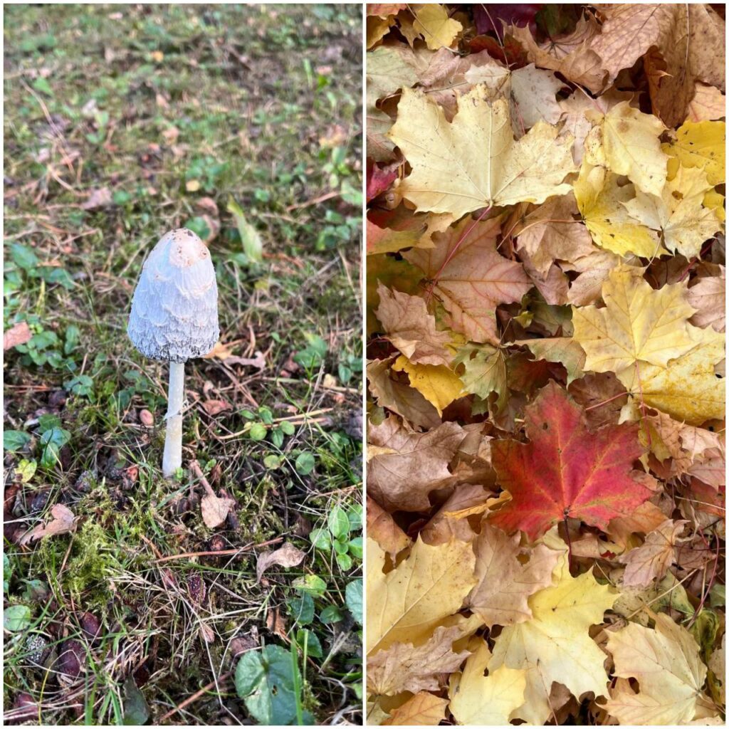- Tintling gesammelt und Herbstlaub – der Pilz liegt in einem Glas, die Blätter in einer Glycerin-Wasser-Lösung