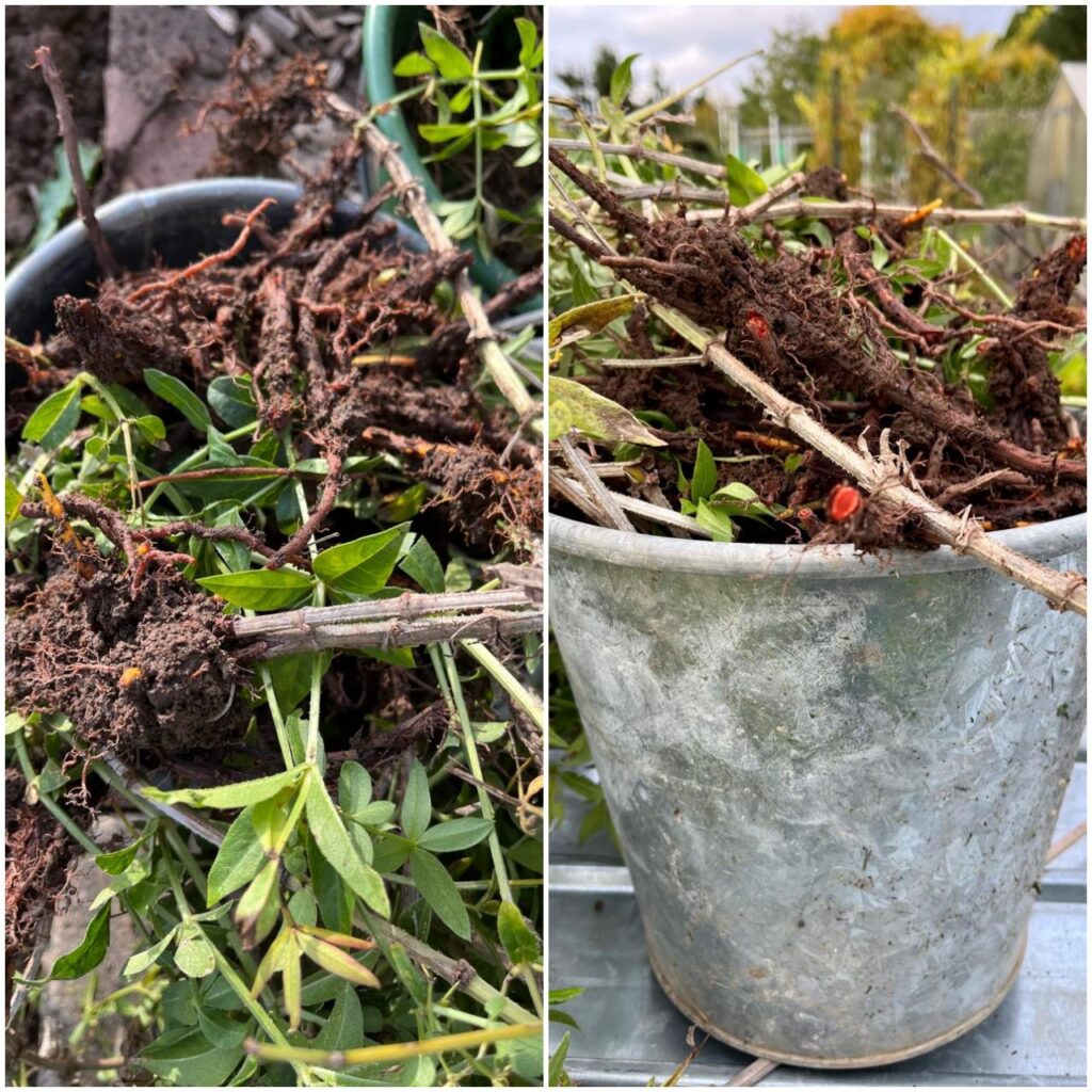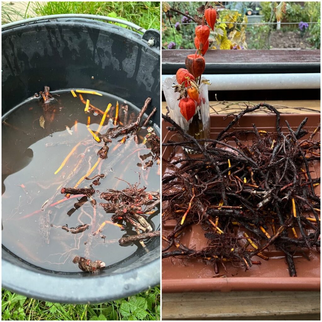 Nun hatte ich einen Eimer voller Krappwurzeln von denen ich nicht weiß, ob es sich lohnt sie zur Farbherstellung zu säubern und zu trocknen. Einige Wurzeln boten sich als Ableger an – ich topfte sie ein. Mal sehen, ob ich AbnehmerInnen bei einem der Kurse im kommenden Jahr finden werde.