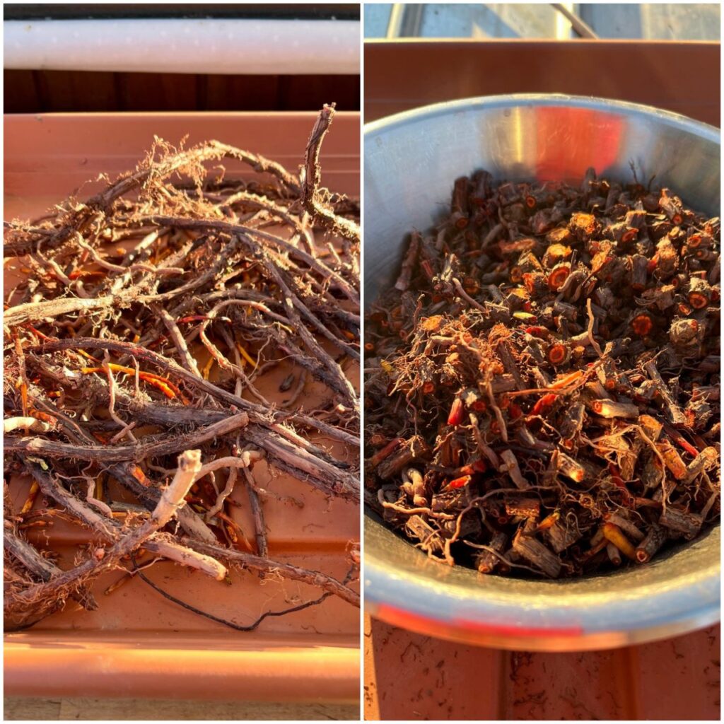Schritt 6: Die noch nicht durchgetrockneten Wurzeln in kleine Stücke schneiden. Zu diesem Zeitpunkt geht das noch recht einfach. Durchgetrocknete Wurzeln sind unglaublich zäh.