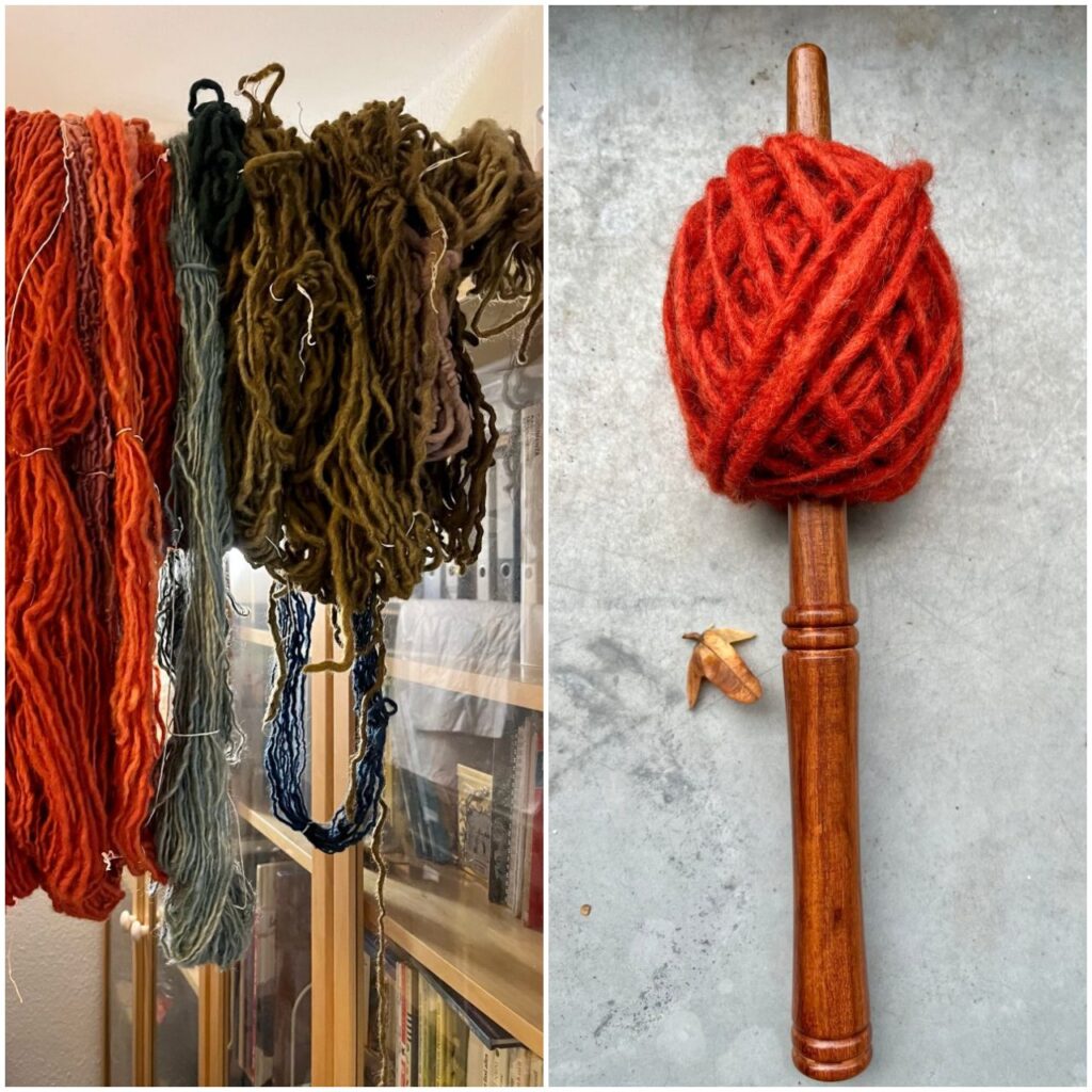 - handgesponnene Restwolle mit Krapp aus der Frühjahrsernte gefärbt. So fanden die vielen kleinen Knäuel eine Bestimmung. In dem Zug bekamen einige andere Garnstränge, die in die Jahre gekommen waren, ein heißes Bad und etwas rostiges Eisenwasser
