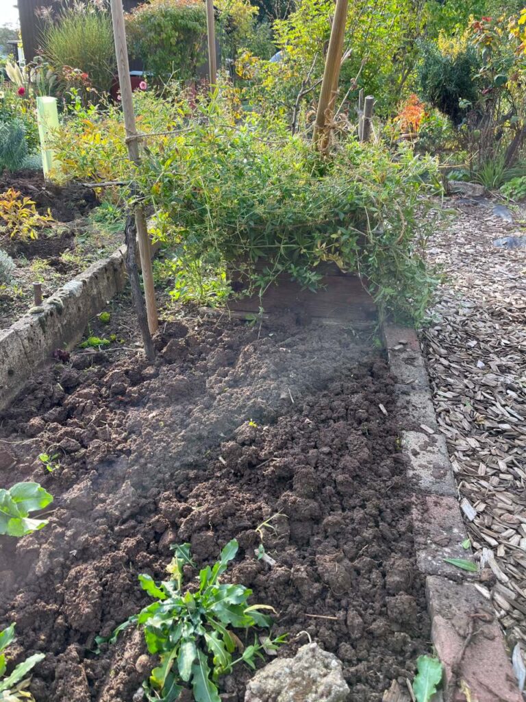 Rund um meinem Kleingarten in der Gartenanlage werden die Gärten winterfertig gemacht. Das heißt hier, die Ackerbeete werden (fast) komplett abgeräumt und umgegraben. Alle Sträucher werden heruntergeschnitten, Dahlien ausgegraben und eingelagert. Die Pflanzen in den Kübeln landen teilweise im Kompost, werden eingepackt oder an frostsicheren Orten untergestellt. Am Ende herrscht der Farbton Braun vor. In wenigen Fällen wird Gelbsenf zur Gründüngung ausgesät und Zwiebeln, wie Knoblauch werden gesteckt. Letzteres ist aktuell die erste Frage: „Hast du den Knoblauch schon drin?“ Habe ich nicht. Kommt noch.