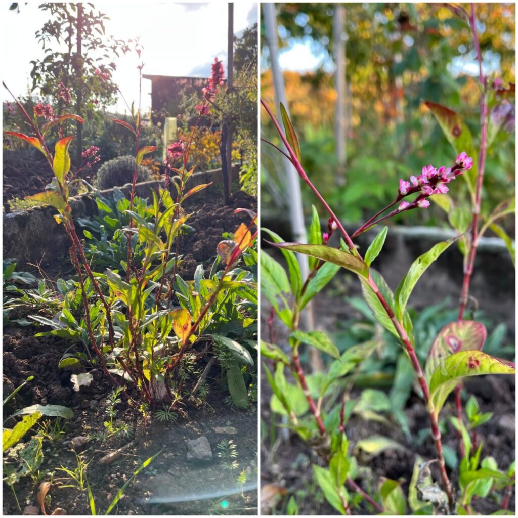 Nach der Krappwurzelernte im Färberpflanzenbeet in vergangenen Woche kam dort eine fast vergessene Färberpflanze von mir wieder zutage, der Färberknöterich, botanisch Persicaria tinctoria. Die Pflanze hatte im Frühjahr zuerst unter der Hitze gelitten, dann an einem zu viel an Wasser, um später vom Krapp fast verdrängt worden zu sein. Jetzt freute ich mich, dass der Knöterich offensichtlich überlebt hat.