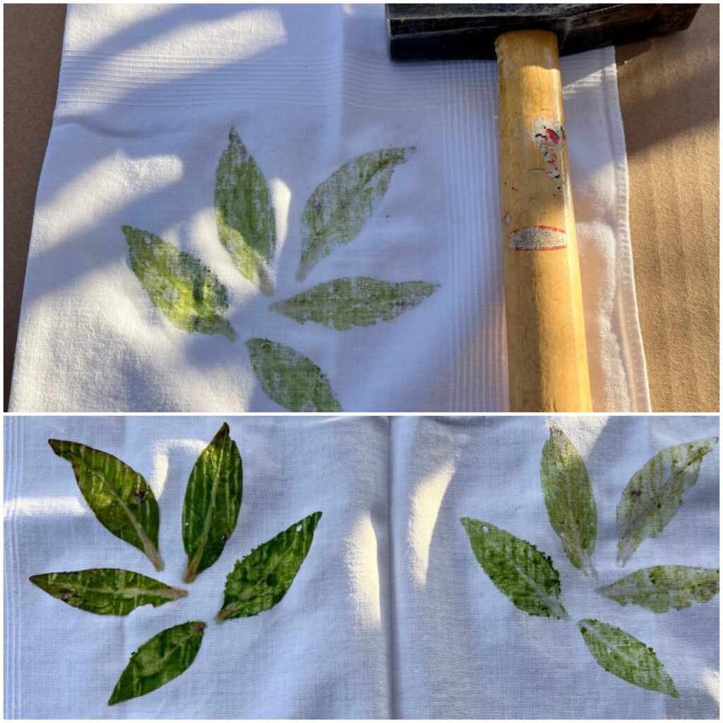 Die Blätter ordnete ich auf einer Seite des Taschentuchs an und klappte die andere Seite darüber. Danach klopfte ich mit dem Hammer den Pflanzensaft aus den Blättern.